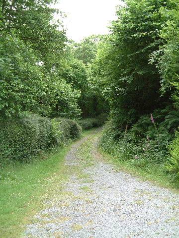 View of driveway from conservatory end of house. River runs behind the hedge on the left-hand side.
